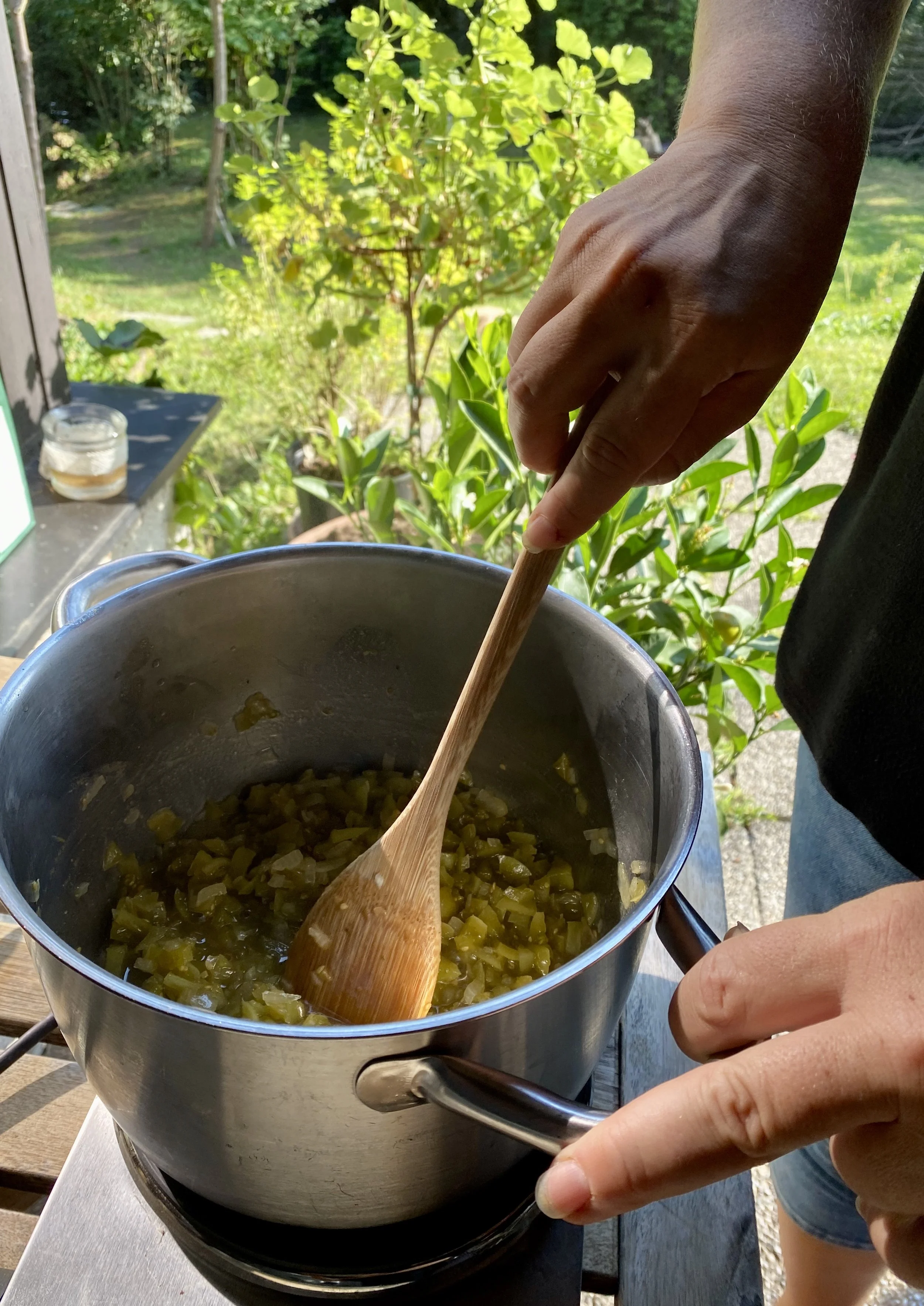 Anschließend wird alles bei gemütlicher Atmosphäre zu wertvollen Schätzen verarbeitet, die sich jeder Teilnehmer mit nach Hause nimmt. Hergestellt werden ein selbstgemachter Hustenwein, eine Blasen/Nieren Tinktur, Feigensenf für Feinschmecker. Dieser ist absolut lecker zu Käse. Aber auch ein grünes Tomaten Chutney und ein regenerierendes Salzpeeling zur Entspannung der Muskulatur.